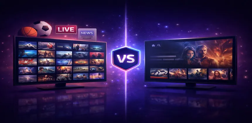 I 2026 er streamingmarkedet mere overfyldt end nogensinde — og de to navne, der oftest dukker op, når folk overvejer at droppe kabel-TV, er IPTV og Netflix. Begge leverer videoindhold via internettet, men det er stort set dér, lighederne slutter. Netflix er en abonnementsbaseret video-on-demand-platform (SVOD), der er bygget op omkring kurateret originalindhold og licenserede film og serier. IPTV er derimod en teknologi, der genskaber den fulde live-TV-oplevelse — titusindvis af kanaler, sport, nyheder og et massivt VOD-bibliotek — alt sammen via din internetforbindelse.